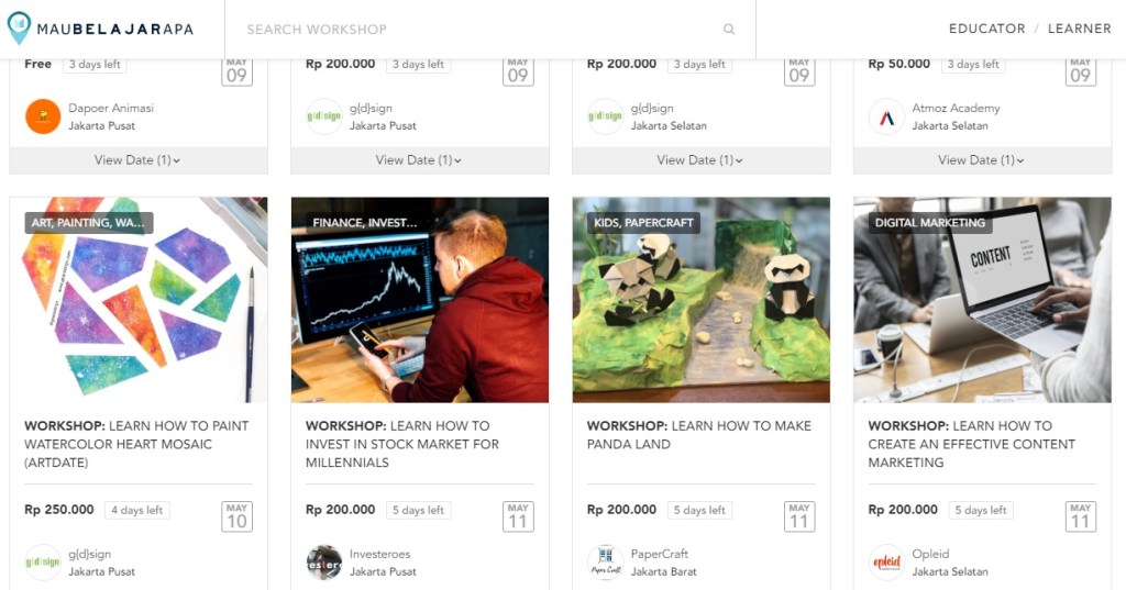 Maubelajarapa.com adalah platform marketplace online yang menawarkan kemudahan bagi masyarakat untuk mencari kelas-kelas vokasional serta workshop yang sedang membuka pendaftaran. Selain mencari kelasnya, kamu juga bisa langsung mendaftar disini untuk mengikuti kelas pilihan kamu. Rentang harga yang harus dibayarkan untuk setiap kelas sangat bervariasi tergantung dari durasi dan siapa penyelenggara kelasnya. Terdapat banyak sekali pilihan kelas yang dapat kamu ikuti, mulai dari kerajinan tangan, hingga kelas-kelas yang lebih serius seperti kelas Digital Marketing.