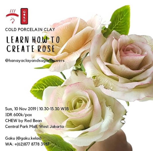 Membuat mawar yang super cantik dan detail banget dengan clay ternyata tidak sesulit yang dibayangkan. Untuk belajar membuat mawar secantik dan sedetail ini dengan menggunakan cold porcelain clay hanya membutuhkan waktu sekitar 2 sampai 3 jam saja. Masa sih? Yuk simak review workshopnya KelasHobi. Kali ini kami berkunjung dan berkesempatan untuk meliput proses workshop yang diadakan oleh Gaku Kelas bersama dengan Hanaya Clay & Sugar Flowers.
