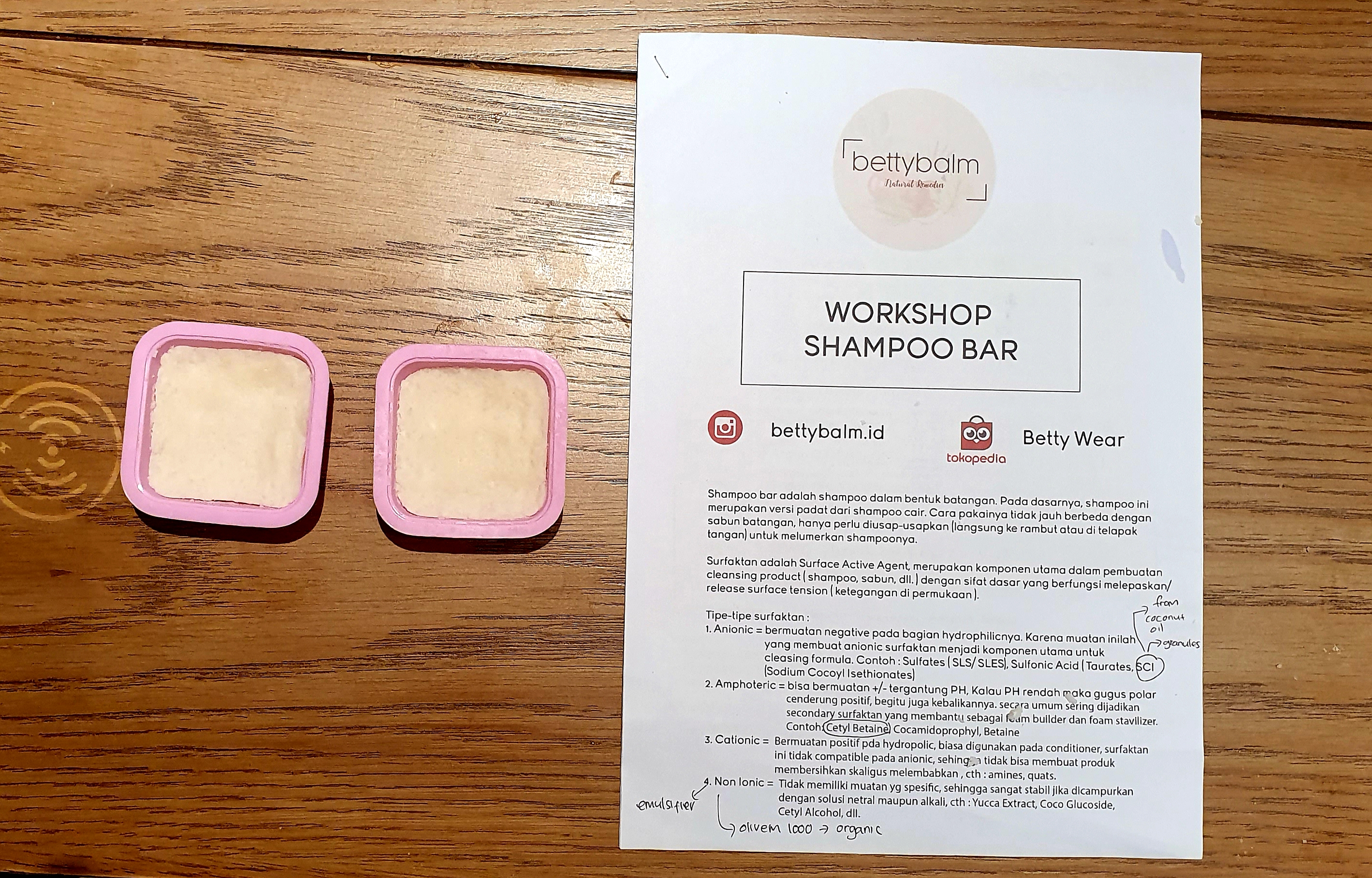 Sedangkan pada pembuatan shampoo, masing-masing peserta diberikan sejumlah material dasar dan dapat membagi shampoo menjadi beberapa buah menggunakan cetakan silikon. Proses pembuatan shampoo lebih sulit dan rumit dibandingkan dengan pembuatan lip balm. Bahannya lebih banyak dan cara mencampurnya juga harus ekstra hati-hati. Walaupun kamu merasa jago DIY (do it yourself), jauh lebih efisien jika kamu belajar langsung dari ahlinya untuk menghidari banyaknya proses trial and error. Selain itu, shampoo yang gagal dapat membuat rambutmu terasa kurang oke saat digunakan.