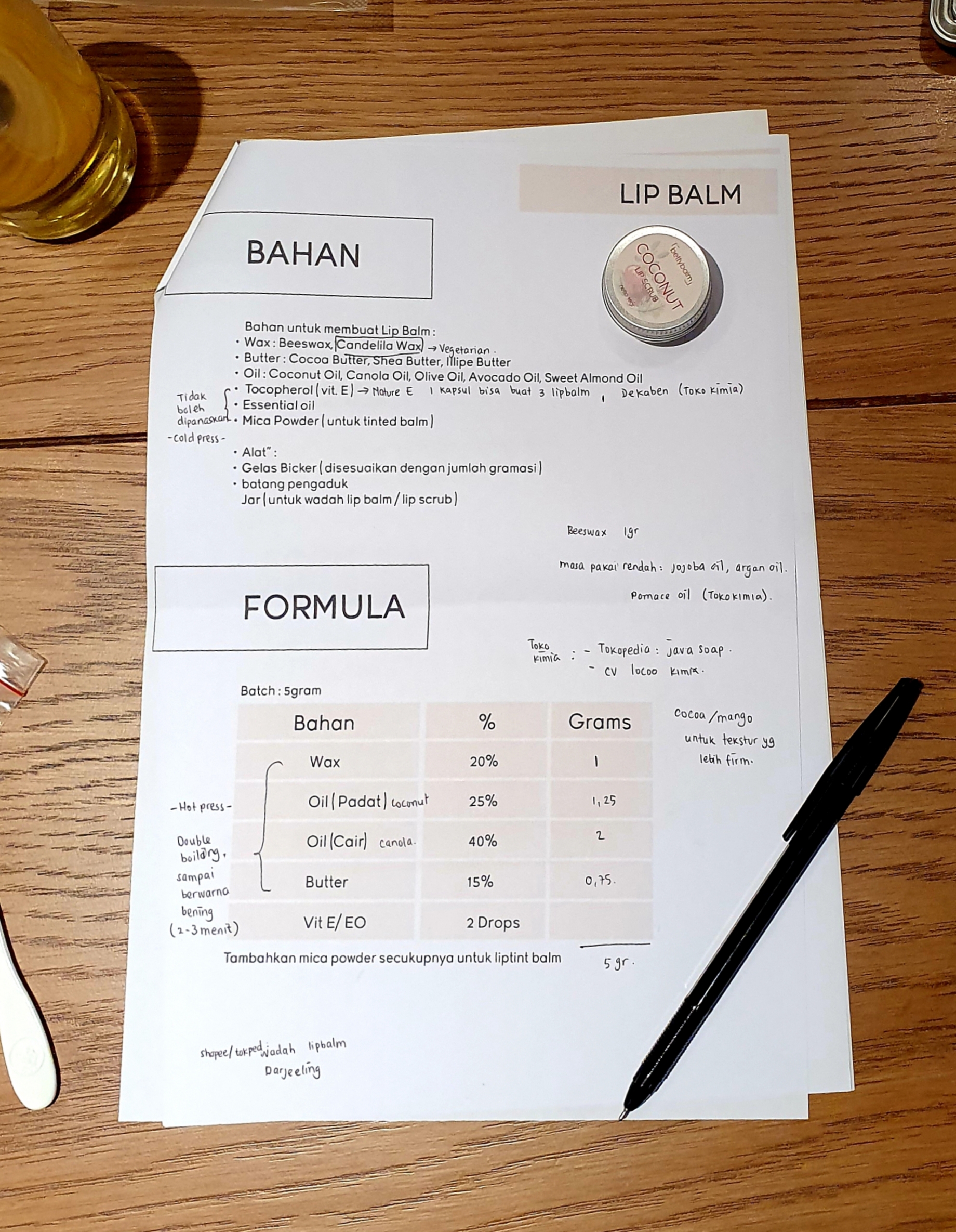 Untuk pembuatan lip balm, masing-masing peserta diberi kesempatan untuk membuat 1 lip balm bening dan 1 lip balm berwarna. Proses membuat lip balm tidak terlalu sulit, namun ada beberapa tips yang sangat penting untuk diingat, contohnya adalah bagaimana cara membuat lip balm dengan tekstur yang tepat, tidak terlalu lunak dan cukup padat agar mudah diaplikasikan ke bibir. Selain itu peserta diajarkan untuk mengenal fungsi dari masing-masing essensial oil. Semua resep dan cara membuatnya dibagikan kepada para peserta dalam bentuk kertas panduan juga sehingga dapat dibawa pulang dan dipraktekkan sendiri di rumah.