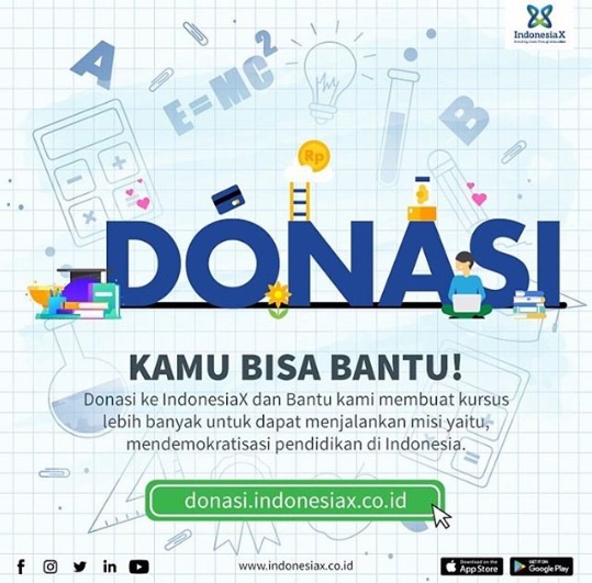 Kalau yang ini gratis. Benar-benar gratis. IndonesiaX merupakan platform edukasi online yang menyediakan kursus-kursus berkualitas yang dibawakan oleh instruktur yang sangat berpengalaman dibidangnya. Untuk kategori materi kursus yang disediakan oleh IndonesiaX ini bukan pelajaran sekolah, melainkan materi yang lebih luas. Kategori yang ada di IndonesiaX diantaranya adalah ekonomi, teknik, kesehatan, bisnis, teknik komputer, lingkungan, hukum, dan lainnya. Sejujurnya jika melihat judul kursusnya, sepertinya materi yang diajarkan ini akan sulit. Tapi setelah memulai kursus, ternyata tidak sesulit itu, walaupun beberapa materi membutuhkan peserta untuk memiliki sedikit dasar terlebih dahulu. Nah keunggulan dari IndonesiaX adalah jika kamu menyelesaikan kursusnya, kamu bisa mendapatkan sertifikat. Tapi, untuk mendapatkan sertifikat ini, kamu akan dikenakan biaya administrasi sebesar IDR 250,000. Follow mereka di @indonesiax_news dan kamu juga bisa berdonasi disini.