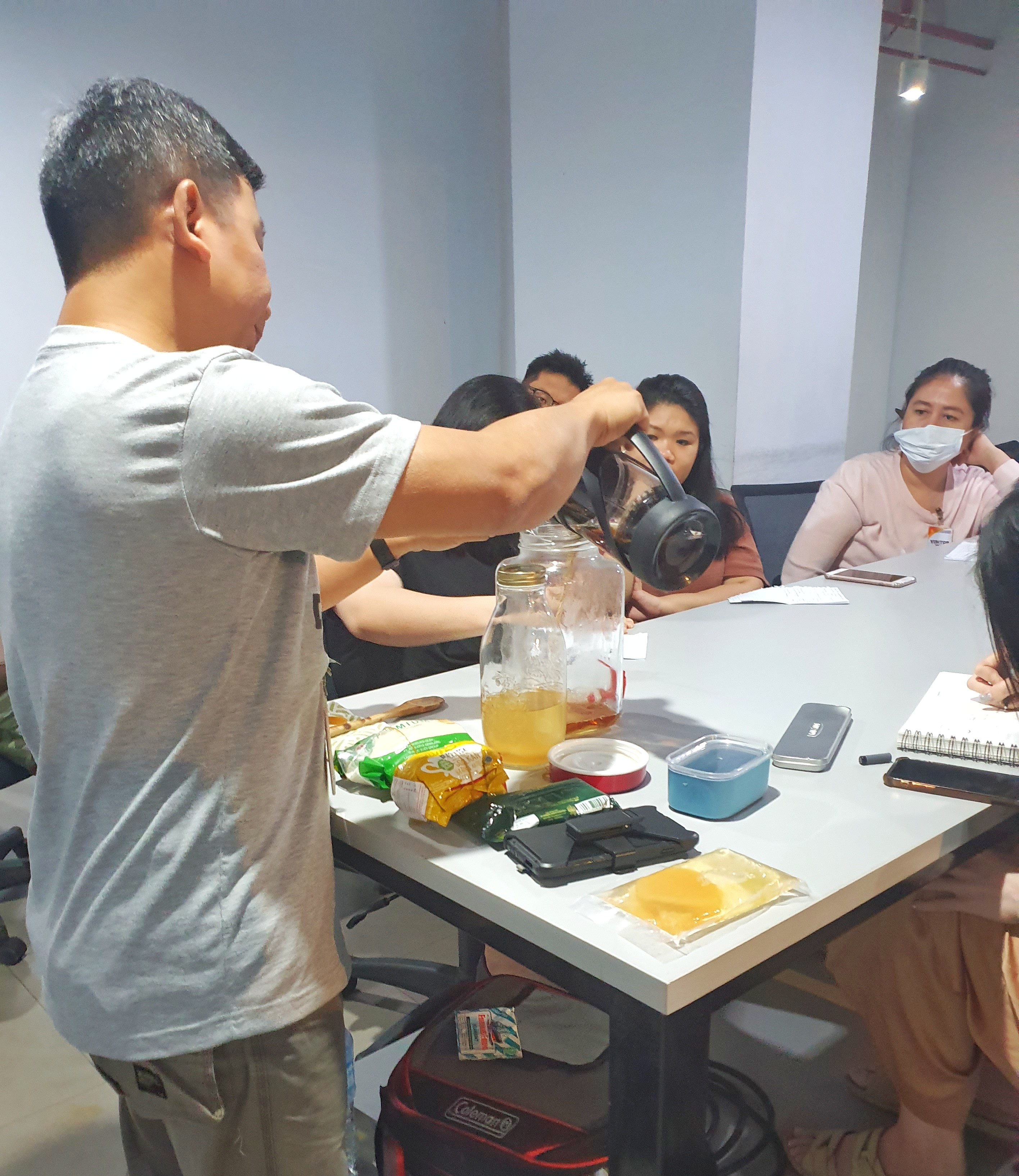 Kak Arsenius memulai dengan menjelaskan apa itu scoby, apa itu kombucha, alat-alat yang digunakan, dan manfaat dari kombucha. Peserta diperbolehkan untuk memberikan pertanyaan hingga acara selesai. Setelah itu, Kak Arsenius mulai melakukan proses pembuatan teh manis yang akan difermentasi. Proses pembuatan teh manis dengan cara seperti biasa, hanya banyak tips dan aturan yang harus diikuti jika peserta ingin berhasil membuat teh kombucha. Misalnya, suhu teh sebelum scoby dimasukan harus sudah mencapai suhu ruangan, karena scoby dapat mati di suhu panas. Selain itu tidak boleh menggunakan air mineral yang mengandung ozone karena dapat mematikan scoby. Setelah scoby dimasukan ke dalam teh manis, langkah selanjutnya adalah menutup toples dengan kain dan menunggu proses fermentasi. Proses fermentasi agar teh dapat menjadi teh kombucha membutuhkan waktu sekitar 7 hingga 14 hari. Selama proses fermentasi, teh harus dijauhkan dari radiasi tv, sinar matahari langsung, makanan, dan harus bersih dari serangga atau binatang lainnya.