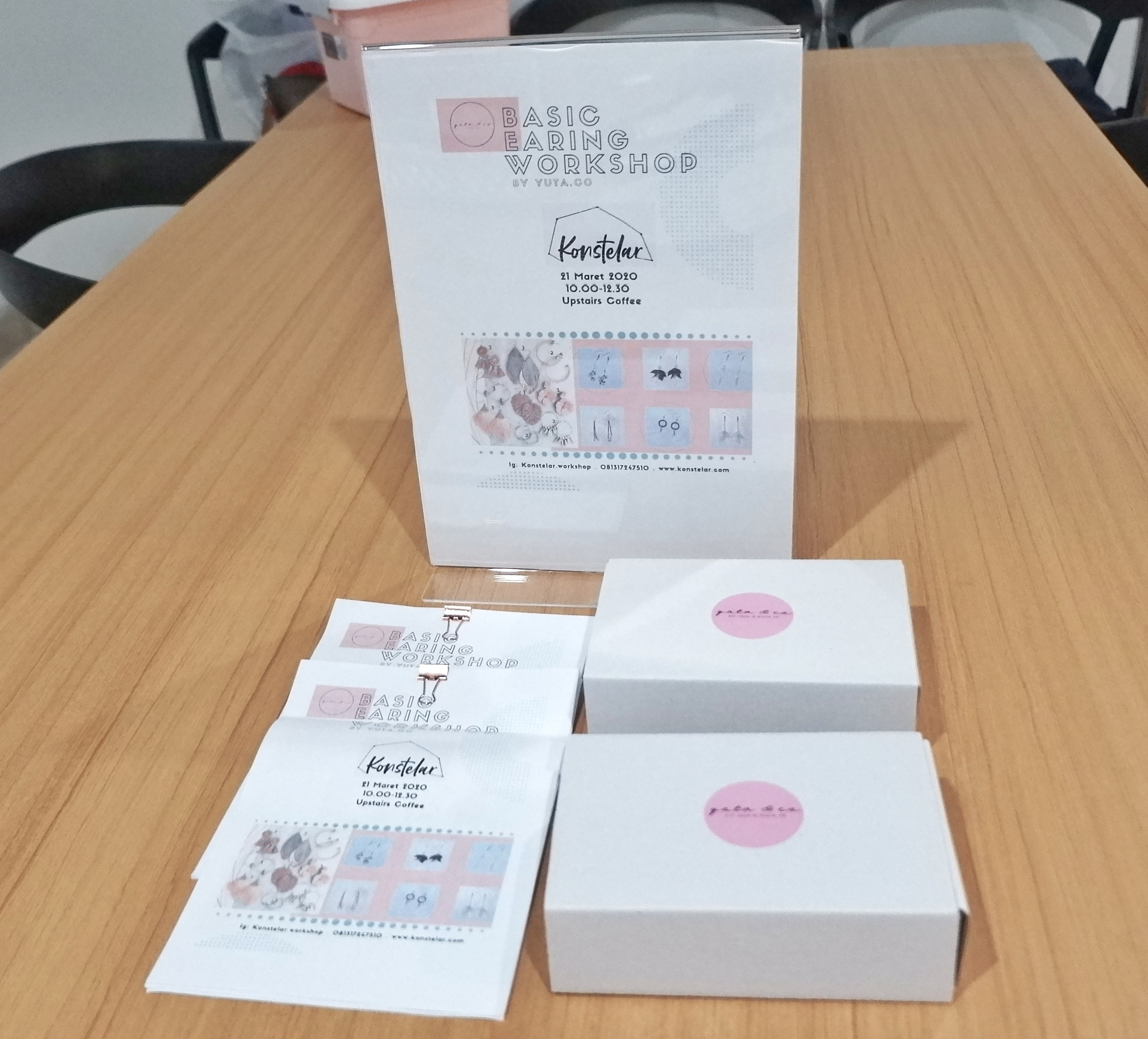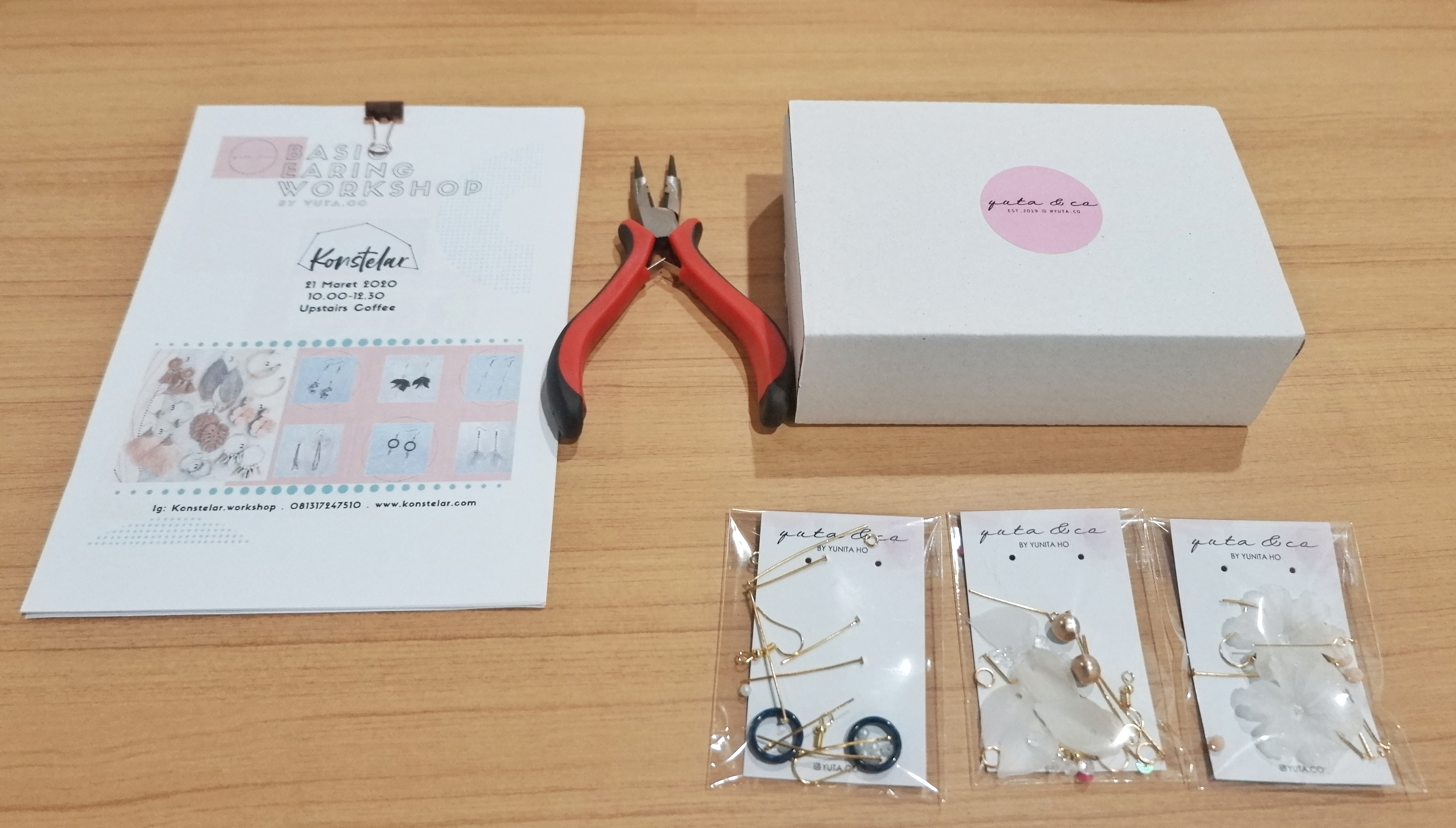 Terlepas dari suramnya kondisi Indonesia saat ini, dengan virus COVID-19 mengintai di mana-mana, KelasHobi sangat bersemangat untuk mengikuti workshop ini. Workshop diadakan oleh Konstelar Workshop dengan Yuta.co sebagai pengajarnya. Kak Yunita dari Yuta.co merupakan lulusan dari jurusan Product Design di Universitas Pelita Harapan. Jadi memang Kak Yunita sangat mendalami materi workshop hari ini. Workshop diadakan pada tanggal 21 Maret 2020 di Upstairs Coffee Sunter. Durasi workshop sekitar 2 jam. Biaya workshop kali ini adalah IDr 300.000 per peserta dan sudah termasuk bahan untuk membuat 3 jenis anting. Karena kondisi Jakarta saat ini, workshop diadakan dengan cara yang sedikit berbeda. Baik peserta maupun tim pengajar, semuanya menggunakan masker dan hand sanitizer selama workshop berjalan. KelasHobi sangat mengapresiasi persiapan dari tim pengajar untuk memberikan kenyamanan dan rasa aman selama workshop.
