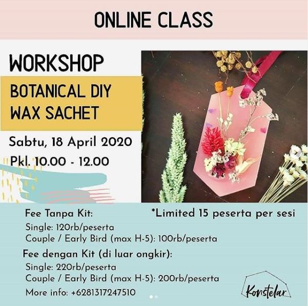 Kelas online kedua yang kami ikuti adalah kelas Botanical Wax Sachet yang diadakan oleh Konsterlar Workshop bersama dengan Mocca Craft (Ibu Tanti) sebagai pengajarnya. Kelas ini menggunakan grup chat whatsapp sebagai sarana mengajar. Materi yang disediakan berupa materi teori dan video tutorial yang bisa diakses di http://www.konstelar.com. Nah karena kelas ini berbayar, materi tersebut dilindungi dengan password dan hanya bisa diakses oleh peserta yang sudah terdaftar. Materi sudah dapat diakses oleh peserta mulai dari 3 hari sebelum kelas. Kelas ini juga menyediakan kit jika peserta ingin mencoba membuat wax sachet namun belum memiliki bahan dan cetakan yang dibutuhkan. Peserta juga dianjurkan untuk mencoba membuat wax sachet terlebih dahulu mengikuti video tutorial yang sudah disediakan agar peserta dapat mendiskusikan kesulitan saat kelas dimulai.
