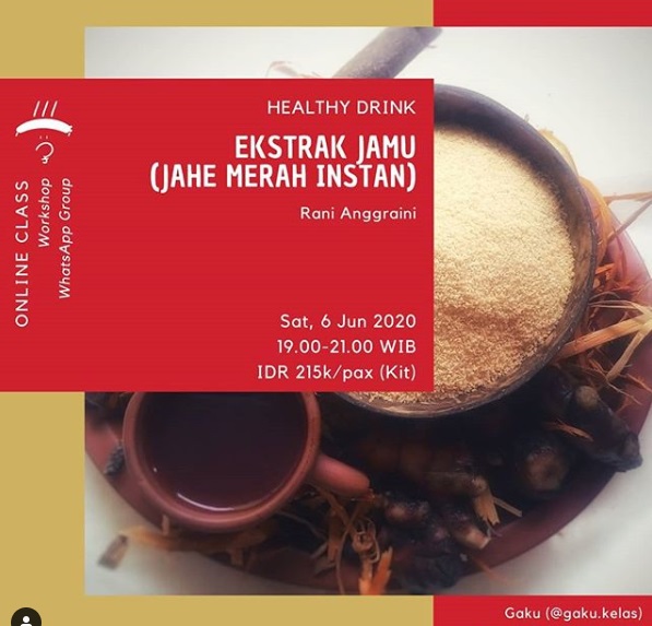 Kelas ini berlangsung dari tanggal 27 hingga 30 April 2020. Karena kelasnya diadakan di chat group, semua materi dan komunikasi juga dilakukan melalui media whatsapp. Kelas dibuka selama 4 hari agar peserta memiliki kesempatan untuk bertanya dan praktek sendiri dirumah. Kelas dimulai dengan sesi perkenalan dari Kak Rani yang ternyata sudah menggeluti bidang jamu selama lebih dari 15 tahun. Jadi sudah banyak produk yang dihasilkan oleh Kak Rani. Materi mengenai jamu dibagikan melalui 2 media, yaitu materi teori dengan format PDF dan video tutorial mengenai cara pembuatan jamu langkah demi langkah. Peserta diharapkan sudah membaca bahan PDF terlebih dahulu sebelumnya. Untuk peserta yang membeli bahan jamu untuk workshop, bahan akan dikirimkan terlebih dahulu sebelum workshop berlangsung. Untuk bahan yang digunakan kali ini, Kak Rani menggunakan jahe merah, kayu manis, cengkeh, kapulaga, dan rempah lainnya. Berikut hasil buatan peserta dan Kak Rani.