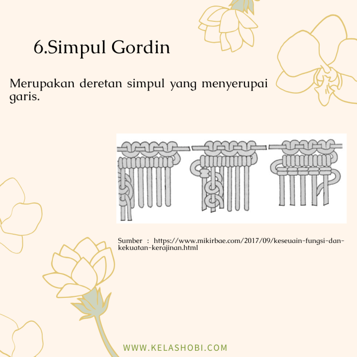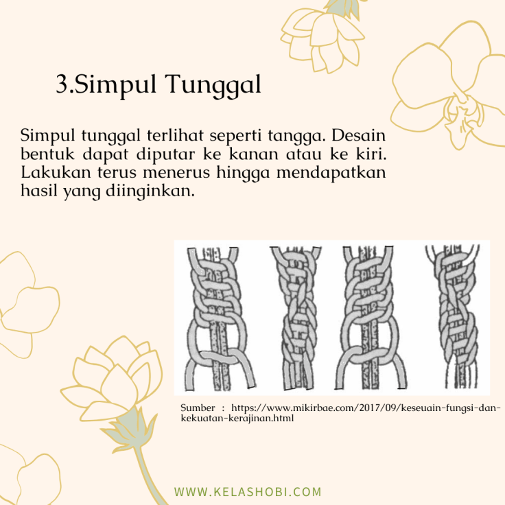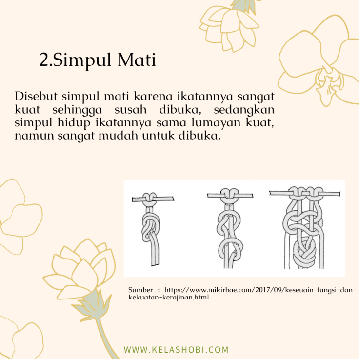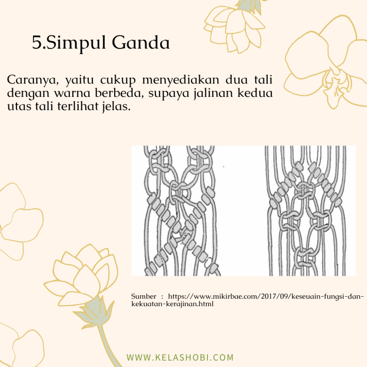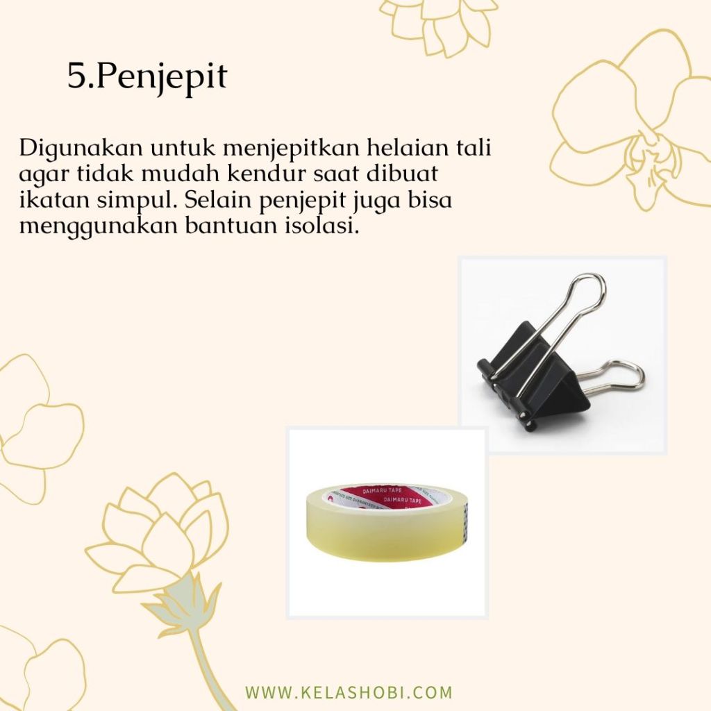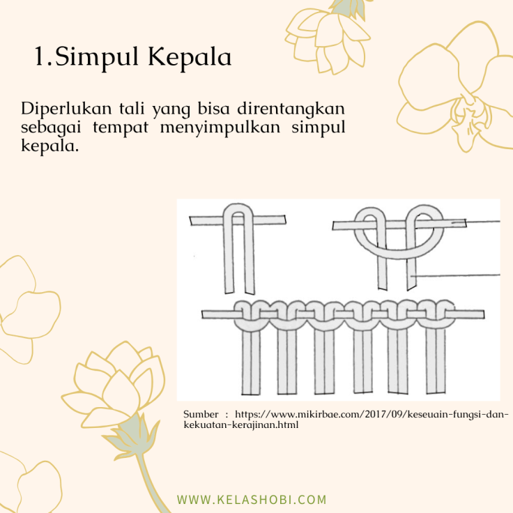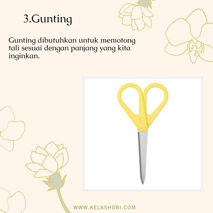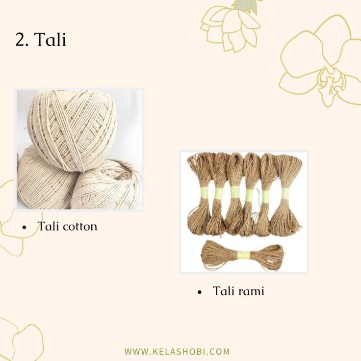 Macrame adalah seni menjalin simpul dan merangkai yang menggunakan bahan seperti benang atau tali sehingga menjadi suatu produk yang indah dan cantik. Banyak produk yang dapat dihasilkan dengan menggunakan teknik macrame, seperti tas, pajangan dinding, taplak meja, gantungan kunci, hingga keranjang gantung. Seni macrame sendiri secara umum dikaitkan dengan teknik yang digunakan oleh penenun Arab dari abad ke 13. Jadi macrame ini tergolong teknik klasik yang kemudian berkembang seiring jaman. Namun sebenarnya seni jalin menjalin simpul untuk membuat hiasan dinding juga sudah dipraktekan di Cina sejak abad ke 3. Saat ini seni dan teknik macrame kembali menjadi trend karena cenderung mudah dipelajari dan hasilnya juga sangat cantik. Beberapa penenun juga memanfaatkan benang atau tali yang didaur ulang dari bahan tekstil maupun kain bekas untuk digunakan lagi menggunakan teknik macrame, sehingga hasilnya selain cantik, juga dapat membantu mengurangi sampah. Untuk mulai mempelajari teknik macrame, kamu harus kenalan dulu dengan alat dan bahannya. Yuk simak slide dibawah ini.