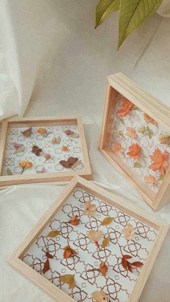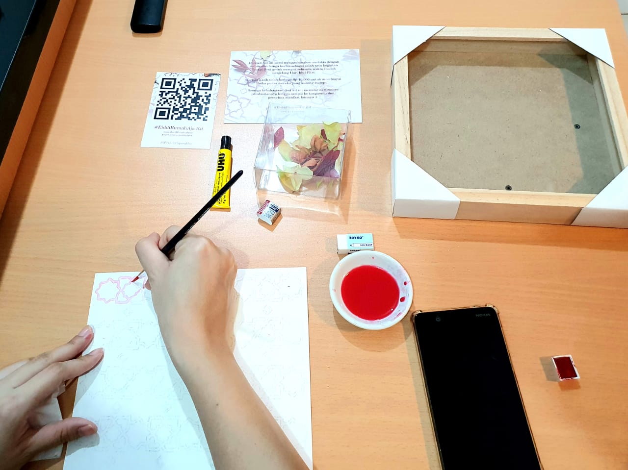 Selanjutnya tinggal mengaplikasikan cat air mengikuti pola yang sudah ada pada kertas sketsa. Untuk langkah-langkah lengkapnya semua ada di tutorial. Prosesnya lumayan simpel, hanya membutuhkan konsentrasi ekstra karena garis pola sangat halus dan detail. Sangat disarankan untuk mencari waktu yang cukup luang agar tidak terburu-buru saat mengerjakan. Setelah selesai mewarnai pola, kita tunggu dulu catnya agar kering sempurna. Jika sudah kering, kita dapat melanjutkan ke tahap selanjutnya, yaitu menempelkan bunga kertas. Pada tutorial sudah ada susunan bunga kertas yang dapat diikuti, namun kita bisa juga menempelkan bunga sesuai dengan selera masing-masing. Langkah yang terakhir adalah merapihkan hasil karya akhir dan memasang lukisan pada pigura 3D.