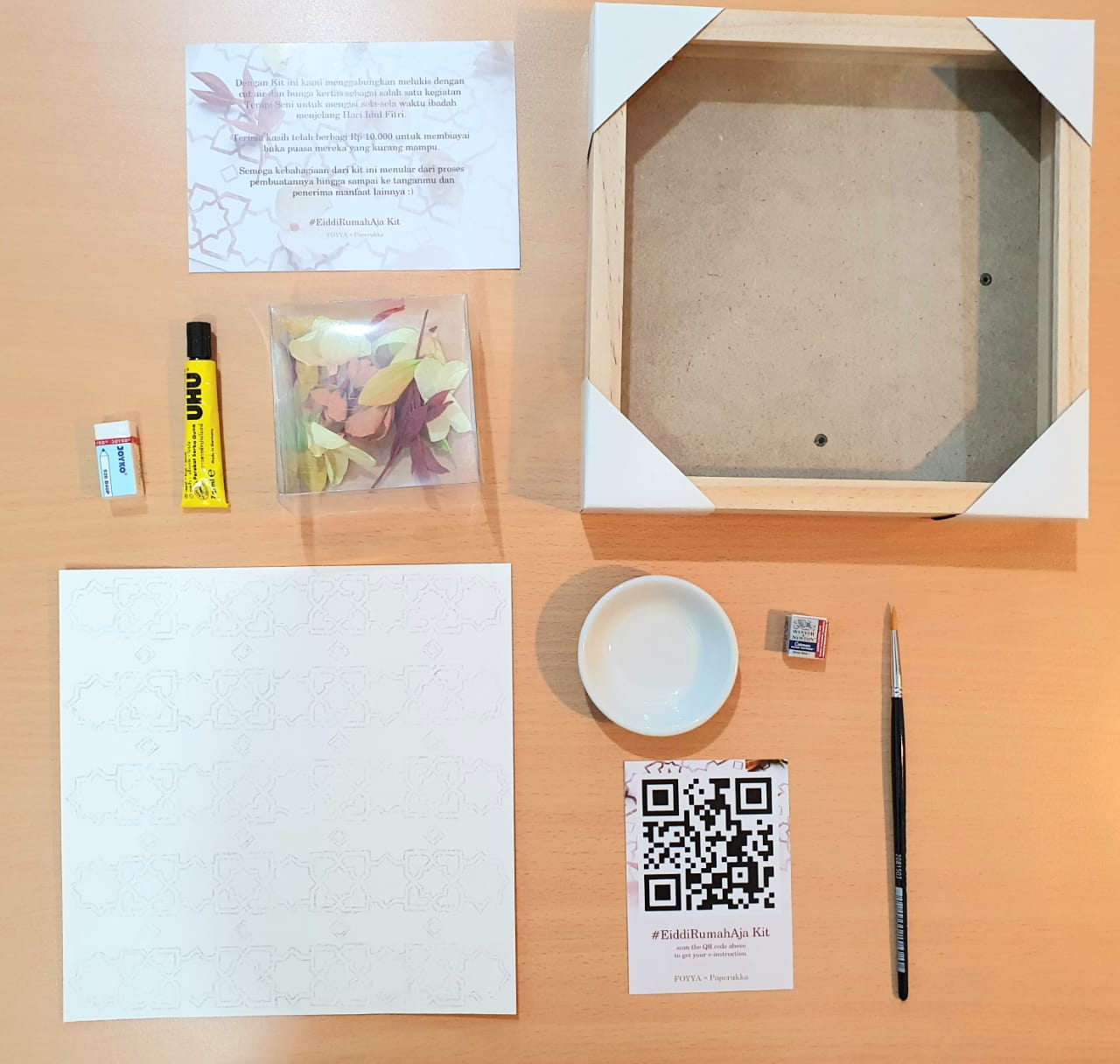 Jadi kitnya super lengkap ya. Ibaratnya, kita tidak perlu menyiapkan apapun lagi saat kita mau mengerjakan kit ini. KelasHobi hanya meyiapkan tissue dan air saja. Untuk tissue, bisa diganti dengan kain juga, tidak masalah. Fungsinya hanya untuk mengelap air yang tumpah atau jika ada kelebihan air pada kuas. Kit terdiri dari: kertas khusus cat air yang sudah ada sketsa, kuas cat air no 3, 1 warna cat air merk Winsor & Newton, penghapus, lem uhu, 1 set bunga kertas yang super realistis dan cantik, wadah air keramik, serta pigura model 3D. Selain itu, terdapat kartu ucapan dan kartu yang berisi QR Code yang dapat discan untuk mengakses tutorial cara merangkai kit. QR Code ini dapat kamu scan melalui smartphone apa saja.