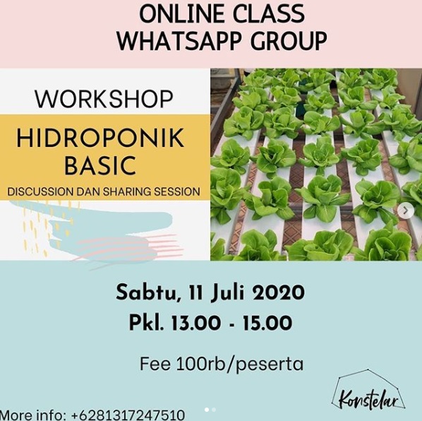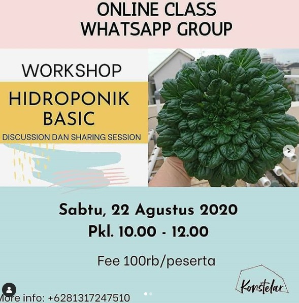 Untuk kamu yang ingin mempelajari lebih lengkap mengenai hidroponik, kamu bisa join kelas online yang sekarang sudah banyak tersedia. Salah satu kelas online yang recommended banget adalah kelas hidroponik online bareng Kokohidroponik yang diadakan oleh Konstelar Workshop. Di kelas ini, peserta belajar mengenai apa itu teknik hidroponik, tanaman apa saja yang bisa ditanam menggunakan teknik hidroponik, alat apa saja yang diperlukan, fungsi dan bagaimana cara menggunakan alatnya, perbedaan antara satu teknik hidroponik dengan teknik lainnya, hingga semua kesulitan dan kendala yang terjadi.
