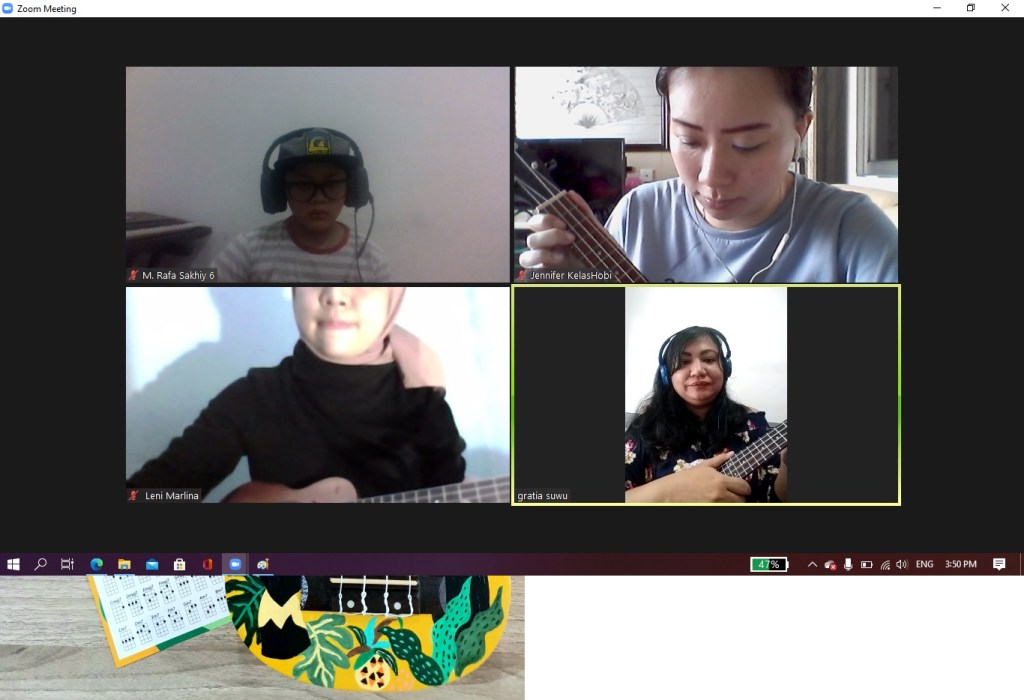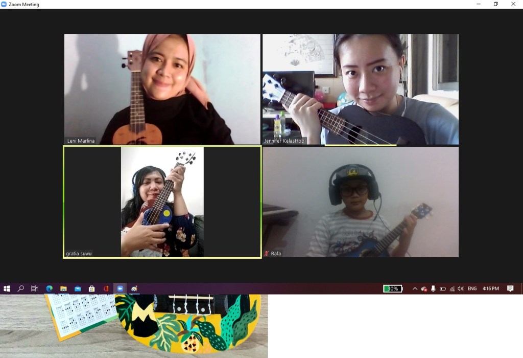 Sayangnya hal tersebut tidak mungkin dilakukan dalam kelas online. Di kelas online ini, peserta sudah harus memiliki atau minimal meminjam ukulele sebelum mengikuti kelas. Namun tentu ada banyak keunggulan lain yang bisa kamu nikmati jika berpartisipasi dalam kelas online. Beberapa keunggulannya adalah, kamu bisa belajar dari rumah, biaya kelas yang lebih murah, dan tidak ada pembatas jarak antara peserta dengan pengajar. Peserta dapat mengikuti kelas dari mana saja, bahkan dari luar negeri sekalipun. Kelas ukulele online ini diadakan menggunakan platform ZOOM dengan durasi sekitar 1 jam per sesi. Apa saja yang dipelajari?