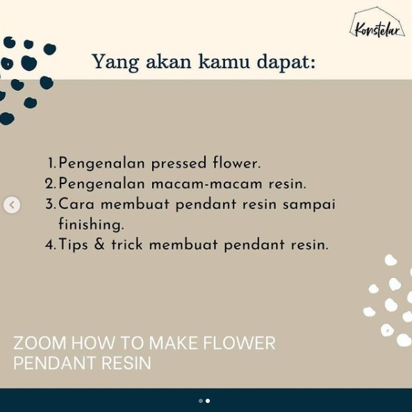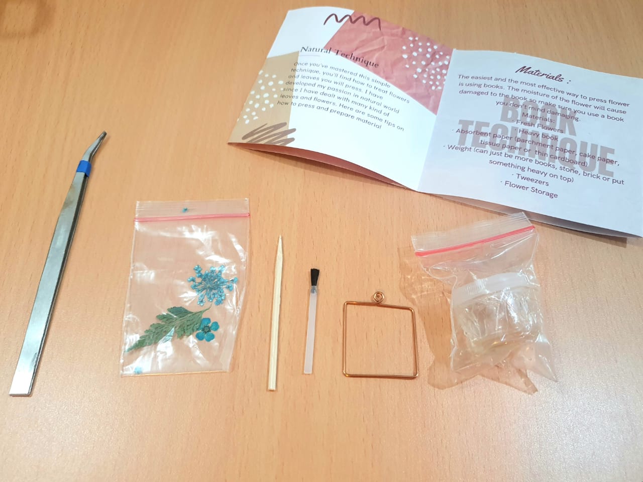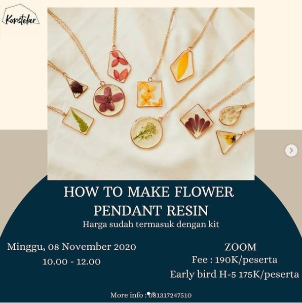 Seperti kelas-kelas online Konstelar Workshop sebelumnya, materi teori dan video tutorial dapat diakses oleh peserta beberapa hari sebelum kelas ZOOM dimulai. Selain berkenalan dengan berbagai macam resin, peserta juga diberikan sedikit gambaran mengenai proses yang akan berlangsung selama kelas. Aksesoris yang akan dibuat kali ini adalah bandul kalung wanita (pendant). Alat dan bahan yang dibutuhkan untuk membuat bandul kalung sudah termasuk dalam kit yang akan dikirimkan kepada para peserta sebelum kelas dimulai. Kitnya sendiri terdiri dari pinset, frame atau bingkai pendant, bunga kering (pressed flower) sebagai inti dari hiasan, bahan resin yang akan digunakan, kuas kecil dan kartu tutorial. Peserta akan dianjurkan untuk menyiapkan tissue basah, hand sanitizer, alas dari karton yang dilapisi plastik, dan gunting.