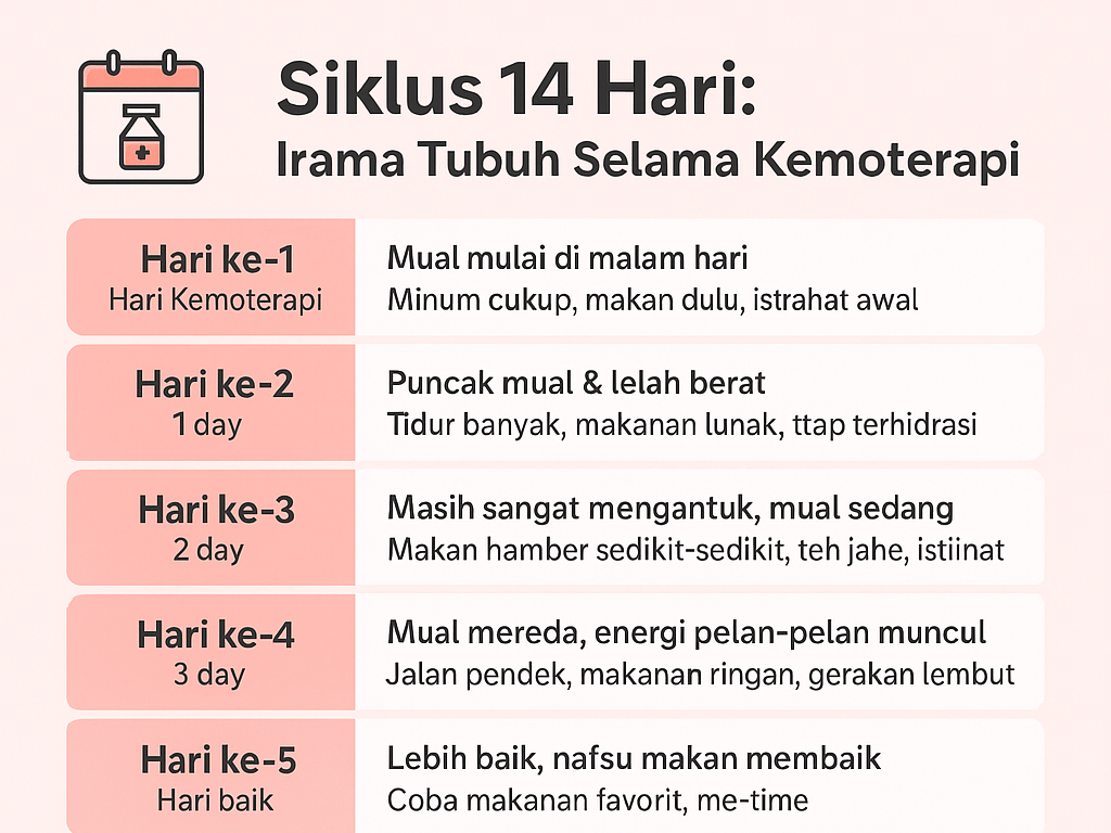 Pro tips: pilih jadwal kemo di hari jumat agar tidak terlalu mengganggu ritme kerja dan buat tracking pribadi untuk mendokumentasikan semua yang kita rasakan selama kemo. Jadi kita bisa bersiap di siklus berikutnya.